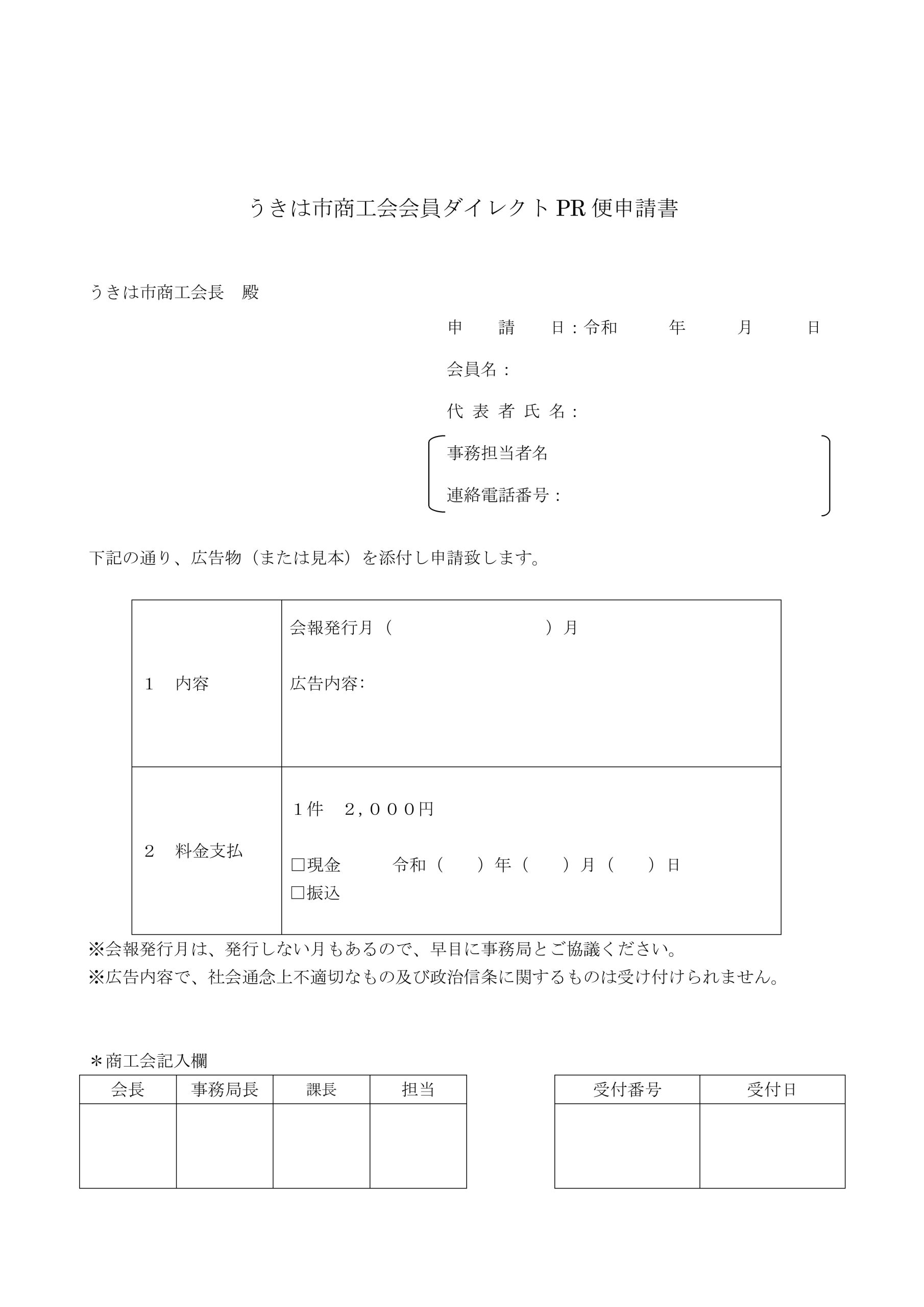 【申請方法】下記に添付している「ダイレクト申請書(様式1)」をダウンロード、印刷、必要事項をご記入の上、手数料とPR広告紙を添えて商工会窓口までお持ちください。